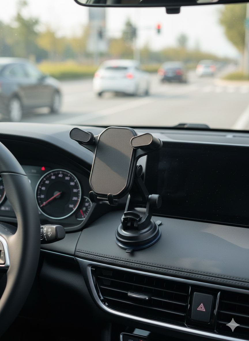 • پایه مکنده دو مرحله‌ای (Ultra-Sticky): پد ژله‌ای این مدل دارای یک لایه چسبندگی نانوی مضاعف است. اهرم فشار روی پایه آن به صورت دو مرحله‌ای عمل می‌کند تا خلاء کامل ایجاد کرده و حتی بر روی داشبوردهای بافت‌دار (چرمی یا طرح‌دار) محکم بماند.